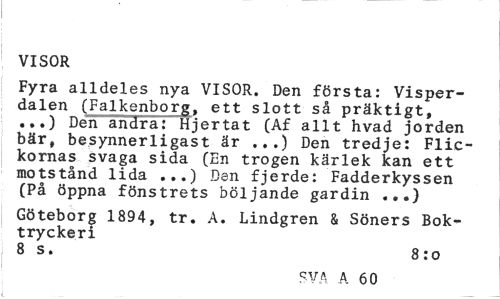 //// VISOR //// Fyra alldeles nya VISOR. Den första: Visper-dalen (Falkenborg, ett slott så präktigt, ...) Den andra: Hjertat (Af allt hvad jorden bär, besynnerligast är ...) Den tredje: Flickornas svaga sida (En trogen kärlek kan ett motstånd lida ...) Den fjerde: Fadderkyssen (På öppna fönstrets böljande gardin ...) //// Göteborg 1894, tr. A. Lindgren & Söners Boktryckeri //// 8 s. 8:0 //// SVA A 60 ////