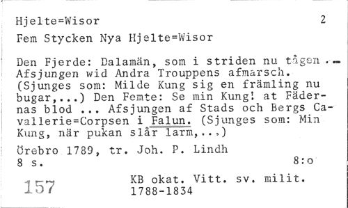 //// Hjelte=Wisor 2 //// Fem Stycken Nya Hjelte=Wisor //// Den Fjerde: Dalamän, som i striden nu tågen . ~ A£sjungen wid Andra Trouppens afmarscli. (Sjunges som: Milde Kung sig en främling nu bugar,...) Den Femte: Se min Kung! at Fädernas blod ... Afsjungen af Stads och Bergs Ca-vallerie=Corpsen i Falun. (Sjunges som: Min Kung, när pukan slår larm,,.,) //// Örebro 1739, tr. Joh. P. Lindh 8 s. 8:o //// ~ » KB okat. Vitt. sv. milit. //// ' 1788-1834 ////