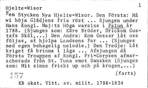 //// Hjelte=Wisor 1 //// Fem Stycken Nya Hjelte=Wisor. Den Förstår Må wi höja Glädjens fria röst ... Sjungen under Hans Kongl. Maj:ts Höga warelse i Falun år 1788. (Sjunges som: Käre Bröder, Drickom Gustafs Skål,...) Den Andra: Kom Gossar låt oss följas, at hjelpa Landsens Far ... (Sjunges med egen behagelig melodie.) Den Tredje: Låt kriget få brinna i låga ... Afsjungen då Första Trouppen af Kongl. Fri=Corpsen afmar-scherade från St. Tuna emot Dansken (Sjunges som: Mit sinne friskt up och på krogen,...) //// - y (forts) //// KB okat. Vitt. sv. milit. 1788-1834 ////