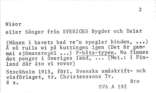 //// 2 //// Wisor //// eller Sånger från SVERIGES Bygder och Dalar //// (Månen i havets bad re'n speglar kinden, ,..) Å så rulla wi på kuttingen igen (Det är gammal sjömansregel . a.) F-båts-typen. Nu finnes det pengar i Sveriges land, (Mel.: I Fin- //// land där åto vi rovor) //// Stockholm 1915, förl. Svenska småskrift- och visförlaget, tr. Christenssons Tr. 8 s. 8:o //// SVA A 192 ////
