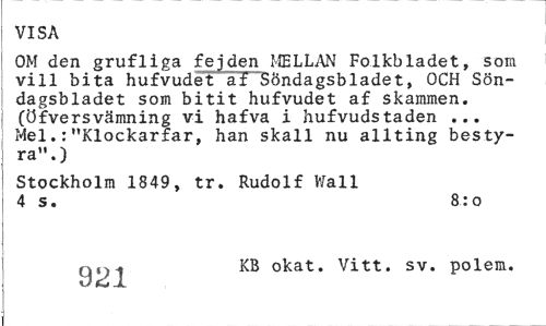 //// VISA //// OM den grufliga fejden MELLAN Folkbladet, som vill bita hufvudet af Söndagsbladet, OCH Söndagsbladet som bitit hufvudet af skammen, (öfversvämning vi hafva i hufvudstaden ... Mel.:"Klockarfar, han skall nu allting bestyra".) //// Stockholm 1849, tr. Rudolf Wall 4 s. 8:0 //// okat. Vitt. sv. polem. ////
