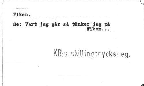 //// Fiken. //// Se: Vart Jag går så tänker jag på //// Fiken... //// KB.S skiilingtrycksreg. ////