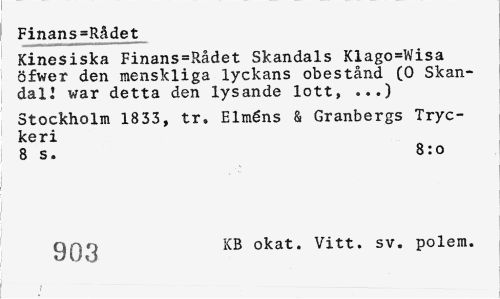 //// Finans=Rådet //// Kinesiska Finans=Rådet Skandals Klago=Wisa öfwer den menskliga lyckans obestånd (0 Skan-dalJ war detta den lysande lott, ...) //// Stockholm 1833, tr, Elméns & Granbergs Tryckeri //// 8 s. Bro //// (j. •: KB okat. Vitt. sv. polem. //// i - - ___ ////