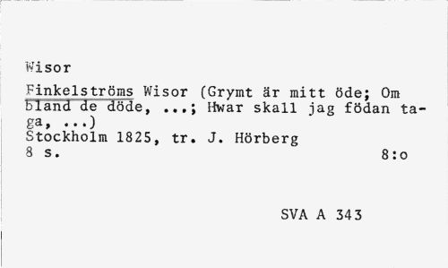 //// Wisor //// Finkelströms Wisor (Grymt är mitt öde; Om ETänd de döde, ...; Hwar skall jag födan taga, ...) //// Stockholm 1825, tr. J. Hörberg 8 s. 8:0 //// SVA A 34 3 ////
