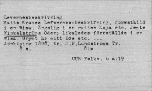 //// Leverneabeskrivning //// Matts Krakes Lefwernea-beakrlfni rp:, föreställd i e^ Wisa* Ängslig i en rutten Koja etc» Jemte Finkalatrcma Öden; likaledes föreställde i en '.Vi saCrrynt är mitt Öde etc. ... Jönköping 1328, tr. J.P.Lundströma Tr. ca. 8:0 //// UUB Folkv, 6 a:19 ////