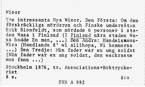 //// Wisor //// Tre intressanta Nya Wisor. Den Första: Om den förskräckliga mördaren och Finske undersåten Erik Blomfeldt, som mördade 6 personer i staden Wasa i Finland (I Finland nära staden Wasa bodde En man, ...) DeiT Andra: Handelsmans-Wisa (Handlande ä* wi allihopa, Wi kommersa »..) Den Tredje: Min fader war en ung soldat (Min fader war en ung soldat, den wackraste man fann ...) //// Stockholm 1876, tr. Associations=Boktrycke-riet //// 8 s. 8: o //// SVA A 982 ////