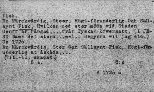 //// ¦Fisk. //// tn Sfärckwärdig, St osr, Högt-förunderlig Och Sällsynt Fisk, Hwilken med stor möda wid Staden Genff "af" fångad ,.. .från Tyskan ofwersatt. (I JESU Namn det stora. . .mel.; Begynna wil jag etc») U© 1726. //// J8n Märckwardig, Stor Ofh Sällsynt Fisk, Högt-fdr* underlig at åskåda,... fri t .-bl. skadat.) //// < 8 s. 8; o //// S 1726 a //// ~ ^ . * • , '-i,"-* w, - ////