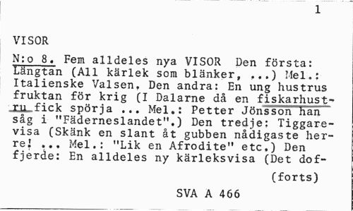 //// 1 //// VISOR //// N:o 8. Fem alldeles nya VISOR Den första: Längtan (All kärlek som blänker, ...) Mel.; Italienske Valsen. Den andra: En ung hustrus fruktan för krig (I Dalarne då en fiskarhustru fick spörja ... Mel.: Petter Jönsson han såg i "Fäderneslandet".) Den tredje: Tiggare-visa (Skänk en slant åt gubben nådigaste herre J ... Mel.: "Lik en Afrodite" etc.) Den fjerde: En alldeles ny kärleksvisa (Det dof- //// (forts) //// SVA A 466 ////