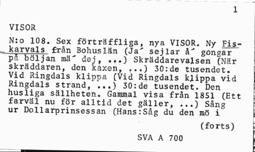 //// 1 //// VISOR //// N:o 108. Sex förträffliga, nya VISOR. Ny Fis-karvals från Bohuslän (Ja"* sej lar å' gongar på böljan mä' dej, .?.) Skräddarevalsen (När skräddaren, den käxen, ...) 30:de tusendet. Vid Ringdals klippa (Vid Ringdals klippa vid Ringdals strand, ...) 30:de tusendet. Den husliga sällheten. Gammal visa från 1851 (Ett farväl nu för alltid det gäller, ...) Sång ur Dollarprinsessan (Hans:Såg du den mö i //// (forts) //// SVA A 700 ////