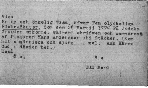 //// Visa //// En ny och ömkelig Wisa, öfwer Fem olyckeliga Fi ak e-Skutor. Som den 28 Marti i 177^ På Judska cfrunden cimkorrmo.. Wälment skrifwen och sammansatt Af Fiskaren Hans Andersson uti Stacken. (Kom hit o människa och sjung,;., mel.: Ach HErre Gud i Högden hor.) Uoeå //// 8 s . 8; o //// UUB Bond //// ;..."."' . ' J . - - ,3 ////