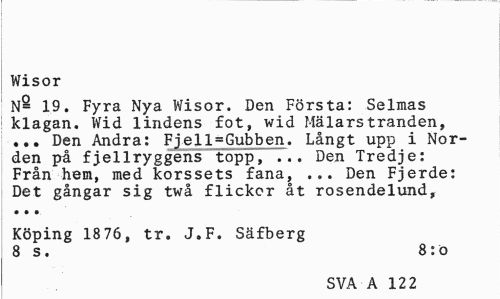 //// Wisor //// N- 19. Fyra Nya Wisor. Den Första: Selmas klagan. Wid lindens fot, wid Mälarstranden, ... Den Andra: Fjell=Gubben. Långt upp i Norden på fjellryggens topp, ... Den Tredje: Från hem, med korssets fana, ... Den Fjerde: //// Det gångar sig twå flickor åt rosendelund, • • • //// Köping 18 76, tr. J.F. Säfberg 8 s. 8:o //// SVA A 12 2 ////
