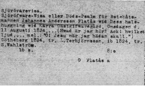 //// Sjörövarevisa. //// Sjörofware-Wi»a elle« Döda-Paal* för Rotebate-mannen Jehannea Anderaeen Flatka wid Dess hals-hu/rgrin/Ä UWt|l!fffW&rd, Onsdagen d. //// 11 Auguati 1824,...(Hwad år jas; hör* Ack 1 hwilkel ljud , *,. mel.; "01 Jeau när jag hädan okall."; Götheberg 1824, tr. L.Terbjcrnaaon, ib 1824, tr. S.Wahl strö». 16 a. //// 0 Flatåa a ////
