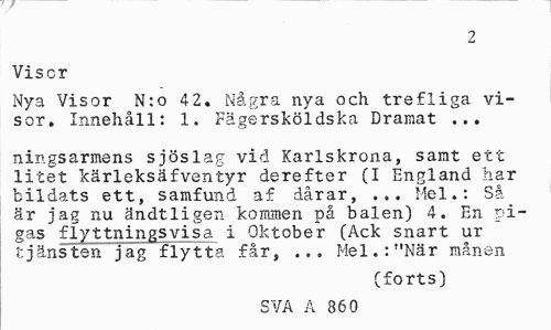 //// 2 //// Visor //// Nya Visor N:o 42. Några nya och trefliga visor. Innehåll: 1. Fägersköldska Dramat ... //// ningsarmens sjöslag vid Karlskrona, samt ett litet kärleksäfventyr derefter (I England har bildats ett, samfund a£ dårar, ... Mel.: Så är jag nu ändtligen kommen på balen) 4. En pigas flyttningsvisa i Oktober (Ack snart ur tjänsten jag flytta får, ... Mel.:"När månen //// (forts) //// SVA A 860 ////