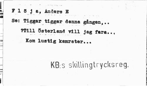 //// F 1 5 j 8, Anåers E Se: Tiggar tiggar denna gången,.. ?Till Österland vill Jag fara.., 5 Kom lustig kamrater... //// KB s skillinglrycksreg. //// i ////