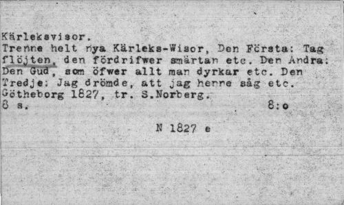 //// Kärleksvisor. //// Trenne helt nya Xärleks-Wisor, Den Fcrsta: Tag flöjten, den fcrdrifwer smärtan etc. Der Andra; Den 3ud , som öfwer allt man dyrkar etc. Den Tredje; Jag drömde, att jag henne såg etc. Götheborg 1827, tr. S.Norberg, ös. 8;o //// N 1827 e ////