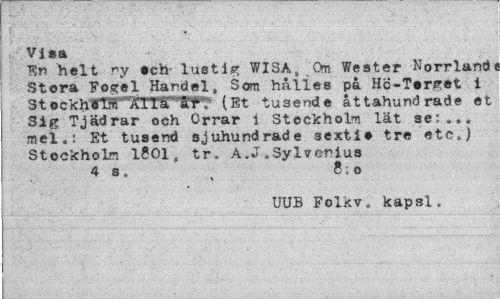 //// Visa //// !?n helt ny sch lust is? WISA, Om V/ester Norrland Stora Fos^el Handel, Som hålles pa HÖ-Tsr^et i St(Et tusende attahunc3rade et Sig Tjädrar och Orrar i Stockholm lät se:... mel.: Et tusend sjuhundrade 3exti» tre etc,) Stockholm 1?01, tr. A.J.Sylvenius 4 s, x 8; o //// UUB Folkv. kapsl. ////