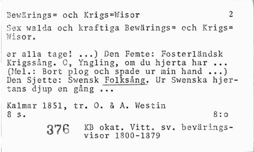 //// Bewärings= och Krigs=Wisor 2 //// Sex walda och kraftiga Bewärings= och Krigs= Wisor. //// er alla tagel .,.) Den Femte: Fosterländsk Krigssång. G, Yngling, om du hjerta har ... (Mel.: Bort plog och spade ur min hand ...) Den Sjette: Swensk Folksång. Ur Swenska hjer-tans djup en gång ... //// Kalmar 1851, tr. 0. & A. Westin 8 s . 8 : o //// 07P KB okat. Vitt. sv. bevärings-0 visor 1800-1879 ////