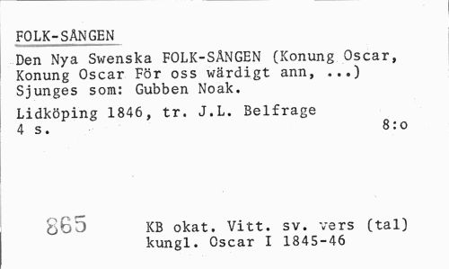 //// FOLK-SÄNGEN //// Den Nya Swenska FOLK-SÄNGEN (Konung Oscar, Konung Oscar För oss wärdigt ann, ...) Sjunges som: Gubben Noak. //// Lidköping 1846, tr. J.L. Belfrage 4 s. 8:0 //// 86ö KB okat. Vitt. sv. vers (tal) //// kungl. Oscar I 1845-46 ////