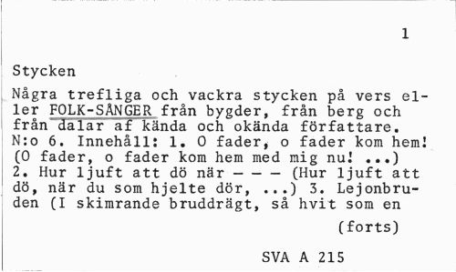 //// 1 //// Stycken //// Några trefliga och vackra stycken på vers eller FOLK-SÄNGER från bygder, från berg och från dalar af kända och okända författare. N:o 6. Innehåll: 1. 0 fader, o fader kom hemJ (0 fader, o fader kom hem med mig nu! ...) //// 2. Hur ljuft att dö när --- (Hur ljuft att //// dö, när du som hjelte dör, ...) 3. Lejonbruden (I skimrande bruddrägt, så hvit som en //// (forts) SVA A 215 ////