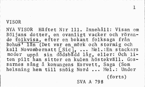 //// 1 //// VISOR //// NYA VISOR Häftet N:r 111. Innehåll: Visan om Böljans dotter, en ovanligt vacker och rörande folkvisa, efter en bekant folksaga från Bohus' län (Det var en mörk och stormig och kall Novombernatt CSicl, ... Mel.:En stackars moder uppå sin dödsbädd låg, eller: Och liten pilt han sitter en kulen höstekväll. Gos-sarnés sång å konungens Korvett, Saga (Som helsning hem till snöig Nord ... Mel.: Under //// (forts) //// SVA A 79 8 ////