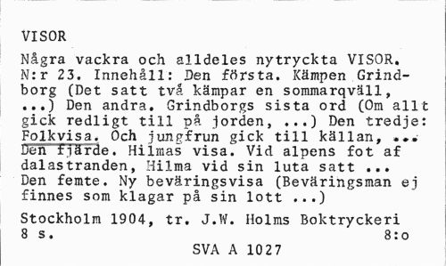 //// VISOR //// Några vackra och alldeles nytryckta VISOR. N:r 23. Innehåll: Den första. Kämpen Grindborg (Det satt två kämpar en sommarqväll, ...) Den andra. Grindborgs sista ord (Om allt gick redligt till på jorden, ...) Den tredje: Folkvisa. Och jungfrun gick till källan, ... uen i;jarde. Hilmas visa. Vid alpens fot af dalastranden, Hilma vid sin luta satt ... Den femte. Ny beväringsvisa (Beväringsman ej finnes som klagar på sin lott ...) //// Stockholm 1904, tr. J.W. Holms Boktryckeri 8 s. 8:o //// SVA A 10 2 7 ////