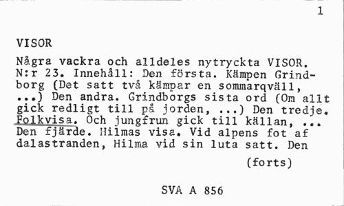 //// 1 //// VISOR //// Några vackra och alldeles nytryckta VISOR. N:r 23. Innehåll: Den första. Kämpen Grindborg (Det satt två kämpar en sommarqväll, ...) Den andra. Grindborgs sista ord (Om allt gick redligt till på jorden, ...) Den tredje. Folkvisa. Och jungfrun gick till källan, ... Den fjärde. Hilmas visa. Vid alpens fot af dalastranden, Hilma vid sin luta satt. Den //// (forts) //// SVA A 856 ////