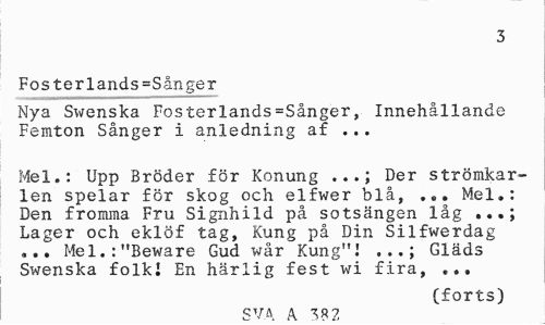 //// 3 //// Fosterlands=Sånger //// Nya Swenska Fosterlands=Sånger, Innehållande Femton Sånger i anledning af ... //// Mel.: Upp Bröder för Konung ...; Der strömkarlen spelar för skog och elfwer blå, ... Mel.: Den fromma Fru Signhild på sotsängen låg ...; Lager och eklöf tag, Kung på Din Silfwerdag ... Mel.:"Beware Gud wår Kung".' ...; Gläds Swenska folk! En härlig fest wi fira, ... //// (forts) //// SVA A 2 ////