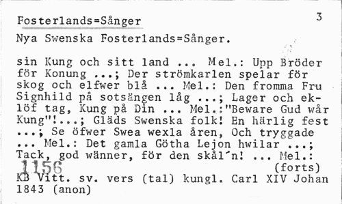 //// ¦7 //// Fosterlands=Sånger //// Nya Swenska Fosterlands = Sånger. //// sin Kung och sitt land ... Mel.: Upp Bröder för Konung ...; Der strömkarlen spelar för skog och elfwer blå ... Mel.: Den fromma Fru Signhild på sotsängen låg ...; Lager och ek-löf tag, Kung på Din ... Mel.:"Beware Gud wår Kung"!...; Gläds Swenska folk! En härlig fest ...j Se öfwer Swea wexla åren, Och tryggade ... Mel.: Det gamla Götha Lejon hwilar ...; Tack, god wänner, för den skål"n! ... Mel.: //// 1158 (fo^s) //// KB Vitt. sv. vers (tal) kungl. Carl XIV Johan 1843 Canon) ////