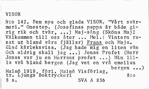 //// VISOR //// N:o 142. Fem nya och glada VISOR. "Vårt svärmeri." Onestep. (Josefinas pappa är både gi-rig rik och tvär, ...) Maj-sång (Sköna Maj.' Välkommen till oss åter ... Mel.: Vintern rasat ut bland våra fjällar) Frans och Maja. Glad kärleksvisa. (Jag hade mig en liten vän Och aldrig skall jag ...) Jonas Profet (Herr Jonas var ju en Herrans profet ...) Min lilla vrå bland bergen (Jag vet en vrå emellan //// ber pen ...) //// Malmö 1919, förl. Malmö Visförlag, //// tr. Ljungs Boktryckeri 8:0 //// 8 s. SVA A 8 36 ////
