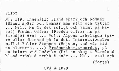 //// 1 //// Visor //// N:r 119. Innehåll: Bland spärr och bommar (Bland spärr och bommar man står och tittar ... Mel.: Nu är det soligt och varmt på Näset) Freden Offras (Freden offras nu på (tredje) året ... Mel.: Alpens isbelagda spira eller Serenad på landet. Internationalen m.fl.) Buller Steppen (Hejsan, vad vår tid nu blomstra, ...) Fredmuns beras-mordet. på en kolare vid Ludvika (Uti en skog i Värmland bland träsk å stubb å snår ... Hel.: Axel och //// (forts) //// SVA A 1029 ////