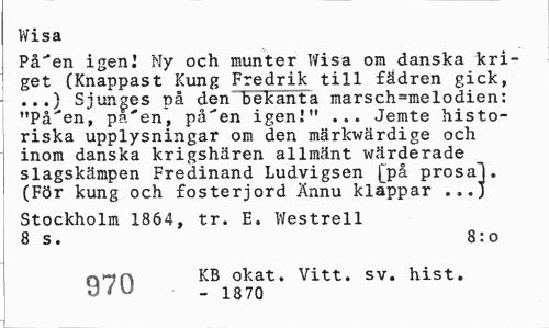 //// Wisa //// På"*en igen I Ny och munter Wisa om danska kriget (Knappast Kung Fredrik till fädren gick, ...) Sjunges på den bekanta marschmelodien: "På^en, pa'en, på^en igeni" ... Jemte historiska upplysningar om den märkwärdige och inom danska krigshären allmänt wärderade slagskämpen Fredinand Ludvigsen [på prosa]. (För kung och fosterjord Ännu klappar ...j //// Stockholm 1864, tr. E. Westrell 8 s. 8:0 //// n>-irv KB okat. Vitt. sv. hist. //// J /U - 1870 ////