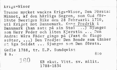 //// Krigs=Wisor //// Trenne mycket wackra Krigs=Wisor, Den Första: Minnet, a£ den härliga Segren, som Gud för-länte Sweriges Rike den 28 Februarii 1710; uti Kriget mot Dannemark. Kong Fredrik i Dannmark (han satt på sin Stol > <>) SJunges som Herr Peder och liten Kj ers tin .Den Andra: Wåra Fäder gingo på (Fast de fingo stötar, ...) Den Tredje: Den Bonde som tänker at äga Soldat .Sjunges som Den första. //// Gefle 1788, tr. E.P. Sundqwist 8 s. 8:o //// - ^ KB okat. Vitt. sv. milit. //// 1788-1834 ////