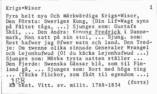 //// Krigs=Wisor 1 //// Fyra helt nya Och märkwärdiga Krigs=Wisor, Den Första: Sweriges Kung, (Din Lif=Wagt syns på Fältet tåga, ...) Sjunges som: Gustafs Skål, ... Den Andra: Konung Fredrick i Danne-mark, Han satt på sin stol, ... Sjung, som: Rest hafwer jag öfwer watn och land. Den Tredje: Om twenne olika sinnade Generaler Wrangel och Lejonhufwud (O! du käcka Lejonhufwud ...) Sjunges som: Mörka tysta natten ställer Den Fjerde: Swenska Gåssar blå, som til Finland gå, ... Sjunges som: Bort med höga ting ... (Täcka Flickor, som fådt til egendom ...; //// Å b^at. Vitt. sv. milit. 1788-1834 (£orts) ////