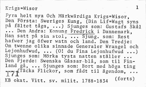 //// Krigs=Wisor * //// Fyra helt nya Och Märkwärdiga Krigs=Wisor, Den Första: Sweriges Kung, (Din Lif=Wagt syns på fältet tåga, ...) Sjunges som: Gustafs Skål ... Den Andra: Konung Fredrick i Dannemark, Han satt på sin stol, ... Sjung, som: Rest hafwer jag öfwer watn och land. Den Tredje: Om twenne olika sinnade Generaler Wrangel och Lejonhufwud, ... (O! du Fina Lejonhufwud ...) Sjunges som: Mörka tysta natten ställer ... Den Fjerde: Swenska Gåssar-blå, som til Finland gå, ... Sjunges som: Bort med höga ting Flickor, som fådt til ägendom, ... //// KB okat. Vitt. sv. milit. 1788-1834 (£orts) ////