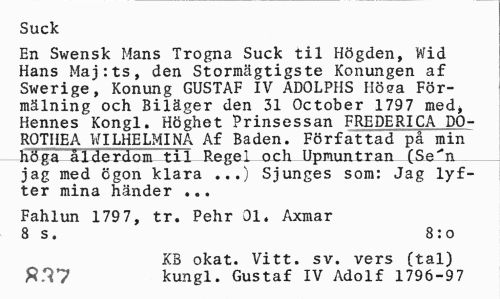 //// Suck //// En Swensk Mans Trogna Suck til Högden, Wid Hans Maj:ts, den Stormägtigste Konungen af Swerige, Konung GUSTAF IV ADOLPHS Höga För-mälning och Biläger den 31 October 1797 med* HennesKongl. Höghet Prinsessan FREDERICA DO-ROTHEA WILHELMINA Af Baden. Författad på min //// jag med ögon klara ...) Sjunges som: Jag lyfter mina händer ... //// Fahlun 1797, tr. Pehr 01. Axmar 8 s. 8:o //// 8 s* KB okat. Vitt. sv. vers (tal) 8:0 //// §38 kungl. Gustaf IV Adolf 1796-97 ////