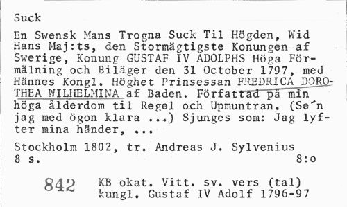 //// Suck //// En Swensk Mans Trogna Suck Til Högden, Wid Hans Maj:ts, den Stormägtigste Konungen af Swerige, Konung GUSTAF IV ADOLPHS Höga För-mälning och Biläger den 31 October 1797, med Hännes Kongl. Höghet Prinsessan FREDRICA_DORO-THEA WILHELMINA af Baden. FörfatrsS-pFlrSr" höga ålderdom til Regel och Upmuntran, (Se^n jag med ögon klara ...) Sjunges som: Jag lyfter mina händer, ... //// Stockholm 1802, tr. Andreas J. Sylvenius 8 s. 8:o //// 8 s* KB okat. Vitt. sv. vers (tal) 8:0 //// §38 kungl. Gustaf IV Adolf 1796-97 ////