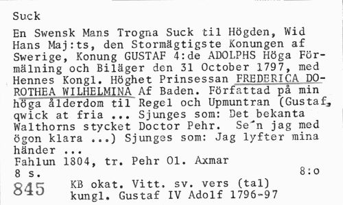 //// Suck //// En Swensk Mans Trogna Suck til Högden, Wid Hans Majrts, den Stormägtigste Konungen af Swerige, Konung GUSTAF 4:de ADOLPHS Höga För-mälning och Biläger den 31 October 1797, med Hennes Kongl. Höghet Prinsessan FREDERICA DO-ROTHEA WILHELMINA Af Baden. Författad på min höga ålderdom til Regel och Upmuntran (Gustaf;, qwick at fria ... Sjunges som: Det bekanta Walthorns stycket Doctor Pehr. Se"n jag med ögon klara ...) Sjunges som: Jag lyfter mina händer ... //// Fahlun 1804, tr. Pehr 01. Axmar 8 s. 8:o //// ojq KB okat. Vitt. sv. vers (tal) 0±0 kungl. Gustaf IV Adolf 1796-97 ////