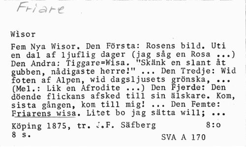 //// Wisor //// Fem Nya Wisor, Den Första: Rosens bild. Uti en dal af ljuflig dager (jag såg en Rosa ...) Den Andra: Tiggare=Wisa. "Skänk en slant åt gubben, nådigaste herre."' ... Den Tredje: Wid foten af Alpen, wid dagsljusets grönska, ... (Mel.: Lik en Afrodite ...) Den Fjerde: Den döende flickans afsked till sin älskare. Kom, sista gången, kom till mig! ... Den Femte: Friarens wisa. Litet bo jag sätta will; ... //// Köping 1875, tr. J.F. Säfberg 8:0 //// 8 s* SVA A 170 ////