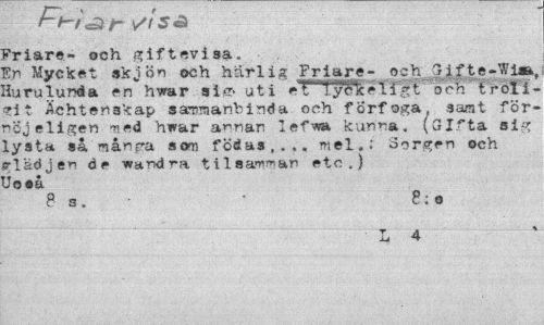 //// f-i-fcär- //sä Friare- och giftevisa. //// En Mycket skjön och härlig Friare- och Gifte-Wim. Huru lund a en hwar sir- uti et lydTceli^t och t relief i t Äehtenakap sammanbinda, och förfoga, samt förnöj eligen -ned hwar annan lef-wa kunna. (Gifta si^ lyata sk mån ra som födas,... mel.: Sorgen och srlädjen de wa,nd^a t il samban etc.) Uoeå //// P s. * 8:o //// L 4 ////