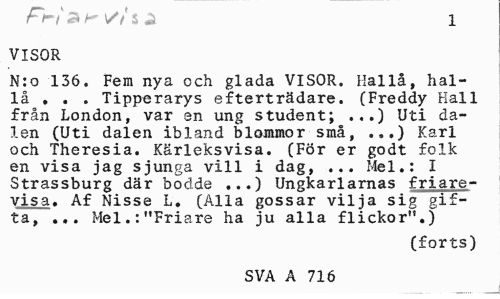 //// r f~t P< K /M J 1 //// VISOR //// N:o 136. Fem nya och glada VISOR. Ilallå, hal-lå , . . Tipperarys efterträdare. (Freddy Hall från London, var en ung student; ...) Uti dalen (Uti dalen ibland blommor små, .,.) Karl och Theresia. Kärleksvisa. (För er godt folk en visa jag sjunga vill i dag, ... Mel.: I Strassburg där bodde ...) Ungkarlarnas friare-visa. Af Nisse L. (Alla gossar vilja sig gifta, ... Mel.:"Friare ha ju alla flickor".) //// (forts) //// SVA A 4 716 ////
