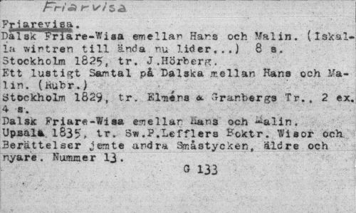 //// Friarevi sa. //// Dal ak Fria re-Wi sa emellan Hars och Malin, (iskalla wintren till ända nu lider...) 8 s. Stockholm 1825, tr. J.Hörberg. //// Ett lustigt Samtal på Dalska mellan Hans och Ma-lin. (Hubr.) //// Stockholm 1829, tr. Elmers o. Granbergs Tr. , 2 ex, 4 s. //// Dalsic Priare-Wisa emellan Håna och -^alin. Upsala 1835. tr. 5w.P.Lefflers F©ktr. Wisor och Berättelser jemte andra äRastycken, äldre och nyare. Nummer 13. //// s 133 ////