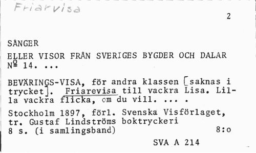 //// 2 //// SÅNGER //// ELLER VISOR FRÅN SVERIGES BYGDER OCH DALAR N§ 14. ... //// BEVÄRINGS-VISA, för andra klassen [saknas i trycket]. Friarevisa till vackra Lisa. Lilla vackra flicka, cm du vill... //// Stockholm 1897, förl. Svenska Visförlaget, tr. Gustaf Lindströms boktryckeri 8 s. (i samlingsband) 8:o //// SVA A 214 ////