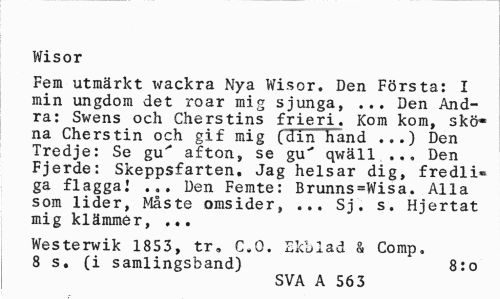 //// Wisor //// Fem utmärkt wackra Nya Wisor. Den Första: I min ungdom det roar mig sjunga, ... Den Andra: Swens och Cherstins frieri. Kom kom, skö* na Cherstin och gif mig (din hand ...) Den Tredje: Se gu^ afton, se gu' qwäll..,. Den Fjerde: Skeppsfarten. Jag helsar dig, fredli» ga flagga! ... Den Femte: Brunns=Wisa. Alla som lider, Måste omsider, ... Sj. s. Hjertat mig klämmer, ... //// Westerwik 1853, tr, C.O. Ekblad & Comp. 8 s. (i samlingsband) 8:0 //// SVA A 563 ////