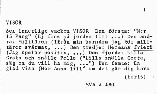 //// 1 //// VISOR //// Sex innerligt vackra VISOR Den första: "N:r 15 Pang" (Ej fins på jorden till «••) Den andra: Militären (Ifrån min barndom jag För militärer svärmat, .,.) Den tredje: Hermans frieri (Jag spelar positiv, ...) Den fjerde: Lilla Greta och snälle Pelle ("Lilla snälla Greta, säg om du vill ha mig, ...") Den femte: En glad visa (Hör Anna lill" om det gör dig harm //// (forts) i //// SVA A 4 80 ////