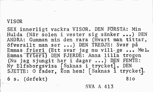 //// VISOR //// SEX innerligt vackra VISOR. DEN FÖRSTA: Min Hulda (När solen i vester sig sänker ...) DEN ANDRA: Gumman min den rara (Hvart man tittar, öfverallt man ser ...) DEN TREDJE: Svar på Emmas frieri (Ett svar jag nu vill ge ... Mel. Emmas frieri) DEN FJERDE: Anna lilla trogen (Nu jag sjungit har i dagar ...) DEN FEMTE: Ny Elfsborgsvisa [Saknas i trycket^. DEN SJETTE: 0 fader, kom hemJ [Saknas i trycket!. //// 6 s. (defekt) 8:0 //// SVA A 413 ////
