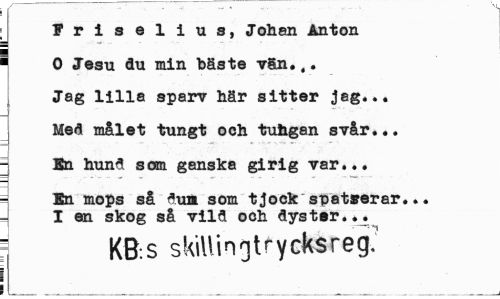 //// F r i s 6 1 i u s, Johan Anton //// 1 0 Jesu du min "bäste vän.,. //// Jag lilla sparv här sitter jag... //// Meci målet tungt och tuhgan svår... //// - En hund sorti ganska girig var... //// En mops så flum som tjock spatarerar... I en skog så vild och dyster... //// 1 KB:S skiUingtfycksregJ ////
