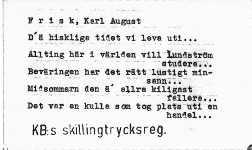 //// Frisk, Karl August //// D'ä hiskliga t idet vi leva uti.,. //// Allting här i världen vill iundström //// studera, //// Beväringen har det rätt lustigt minsann» •. //// Mi5sommarn den ä' a^lra kiligast //// fallera.,. //// Det var en kulla som tog plats uti en 1 handel... //// KB:S skiUingtrycksreg. //// I ////