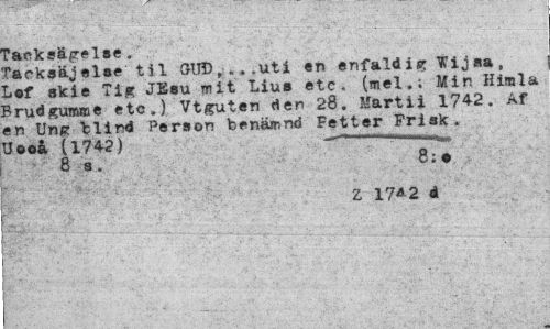 //// Tacksägelse„ //// Tacksäj else t i 1 GUD,.uti en enfaldVijna, Lof akie Tig JEsu mit Lius etc. (mel.; Min Himla Brudgumme etc.) Vtguten den 28. Marti i 1742. Af en Uns "blind Person benämnd Fetter Frisk. Uooå (1742) 111 — //// 8 s. 8: • //// Z 17A2 d //// tvki?*. ••• . . V-i»"-'/'¦ ".T."' //// ' y . ' . . '¦ ,' . ''U-^i "V' ////