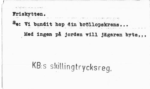 //// Friskytten. //// se: "Vi bundit hop din bröllopskrans... //// Med ingen på jorden vill jägaren byta,,, //// I //// KB.s skiUingtrycksreg. ////