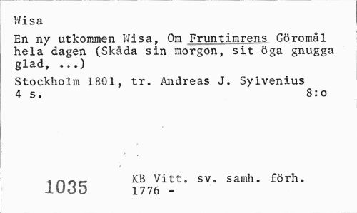 //// Wisa //// En ny utkommen Wisa, Om Fruntimrens Göromål hela dagen (Skåda sin morgon, sit öga gnugga glad, ...) //// Stockholm 1801, tr. Andreas J. Sylvenius 4 s. 8:0 //// r\r»r- Vitt. sv. samh. förh. //// 1035 1776 - ////